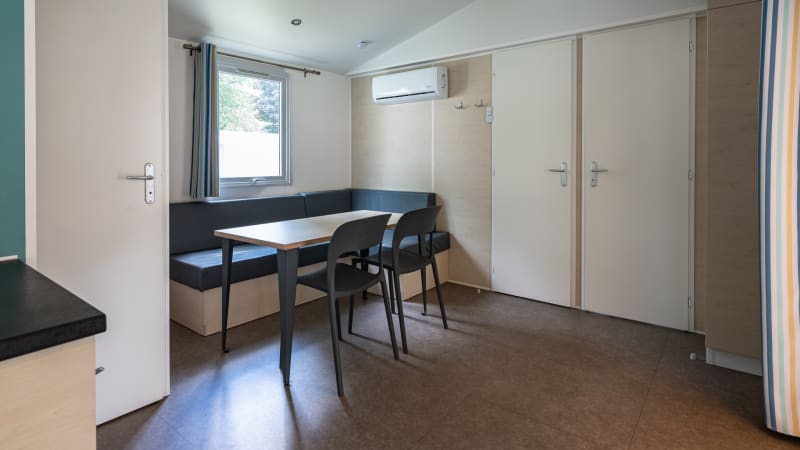 Nach einem Tag im Schnee kann man es sich auf dem bequemen Sofa oder am Esstisch mit Sitzbank und zwei Stühlen gemütlich machen.