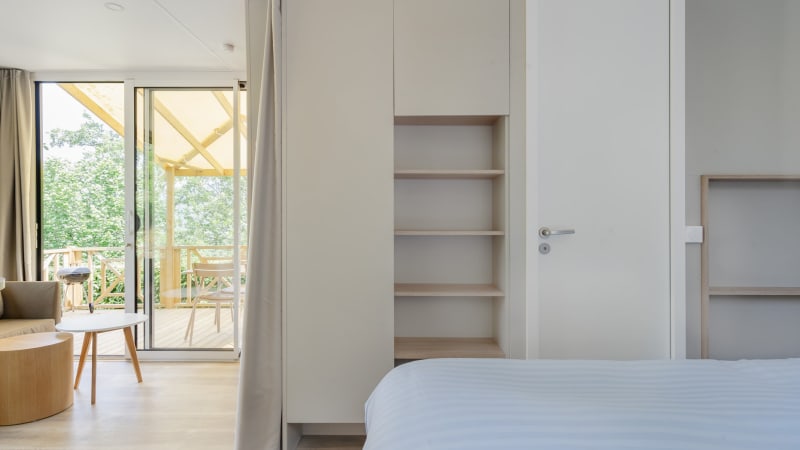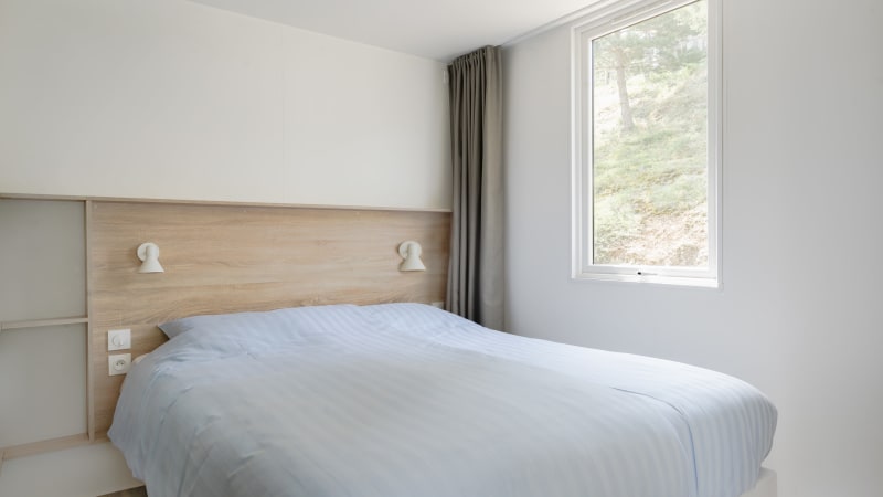 Das Mobilheim Fare verfügt über ein Doppelbett, das in zwei Einzelbetten (80x200) geteilt werden kann. Die Betten und Matratzen bestehen aus hochwertiger Hotel-Qualität.