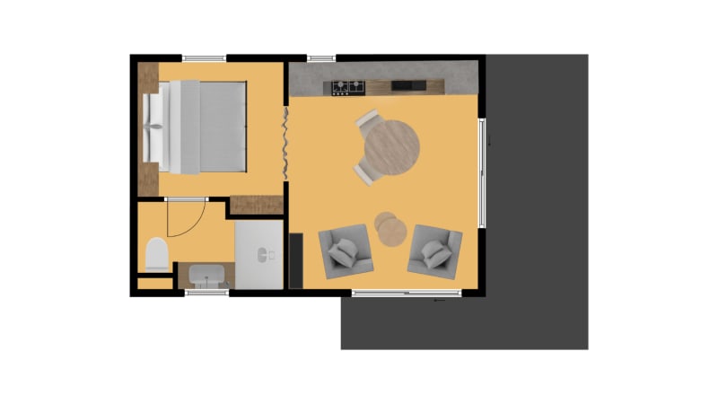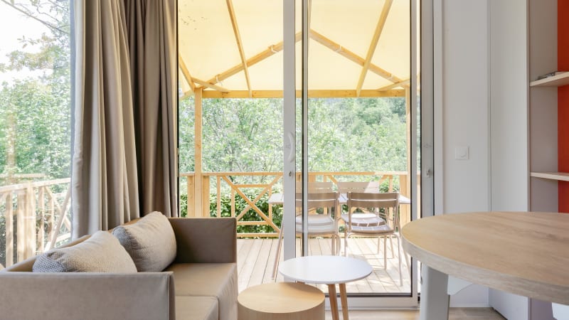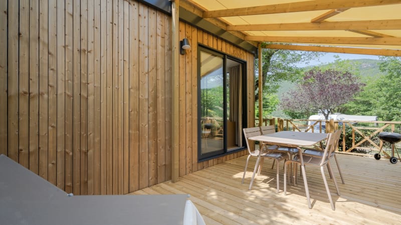 Das luxuriöse zwei Personen Mobilheim Fare ist ideal für eine Nacht oder für einen längeren Aufenthalt. Wenn Sie aufwachen, haben Sie die prachtvolle Aussicht über die Bergspitzen der französischen Alpen. Die Mobilheime haben eine teilweise überdachte Terrasse sowie Terrassenmöbel und sind ebenfalls mit allem Komfort ausgestattet.