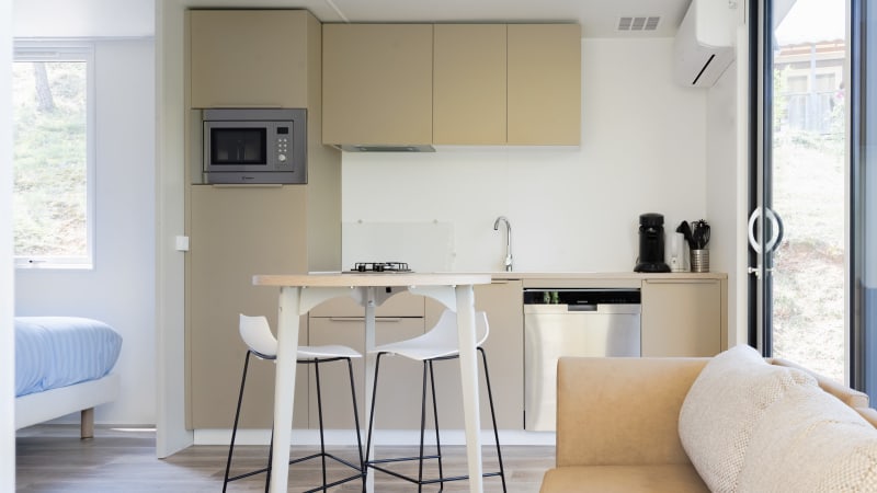 Das Mobilheim Fare verfügt über eine luxuriös ausgestattete Küche mit einem 2-Flammen Gasherd mit Abzugshaube, einem Kühlschrank mit Gefrierfach, einer Geschirrspülmaschine (Siemens), einer Kombi-Mikrowelle, eine Nespresso- und Filterkaffeemaschine und einem Wasserkocher.