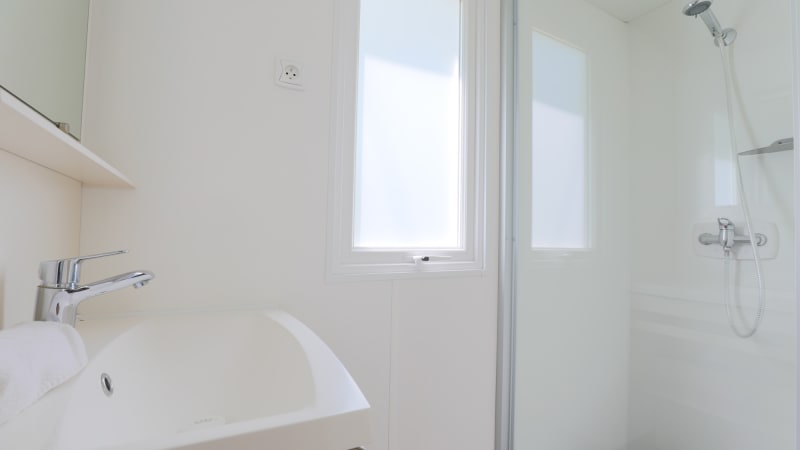 Badezimmer Das Mobilheim verfügt über ein Badezimmer mit Dusche und Waschbecken sowie eine separate Toilette.