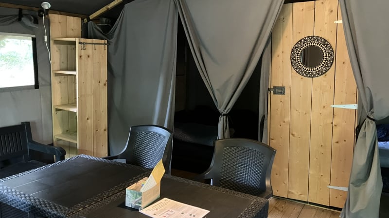 Die Vorderseite des Zeltes können Sie weit öffnen, so bekommen Sie ein geräumiges „im Freien“ Gefühl. Das Wohnzimmer ist mit einem Gartenmöbelset für vier Personen ausgestattet, das sowohl drinnen wie auch draußen aufgestellt werden kann.