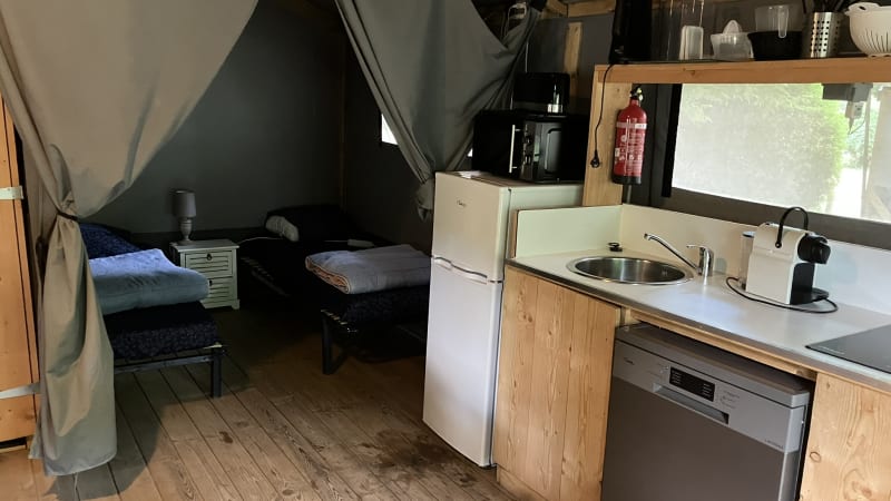 Das Zelt verfügt über eine Miniküche. Mit einer kompletten Küchenausstattung, einer 4-flammigen Kochplatte, einem Kühlschrank mit Gefrierfach, einer Nespresso Kaffeemaschine, einer Filterkaffeemaschine, einem Wasserkocher und einer Mikrowelle.