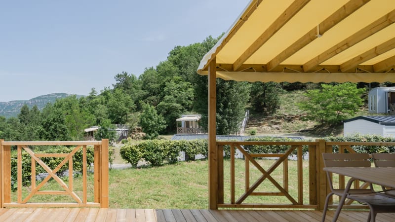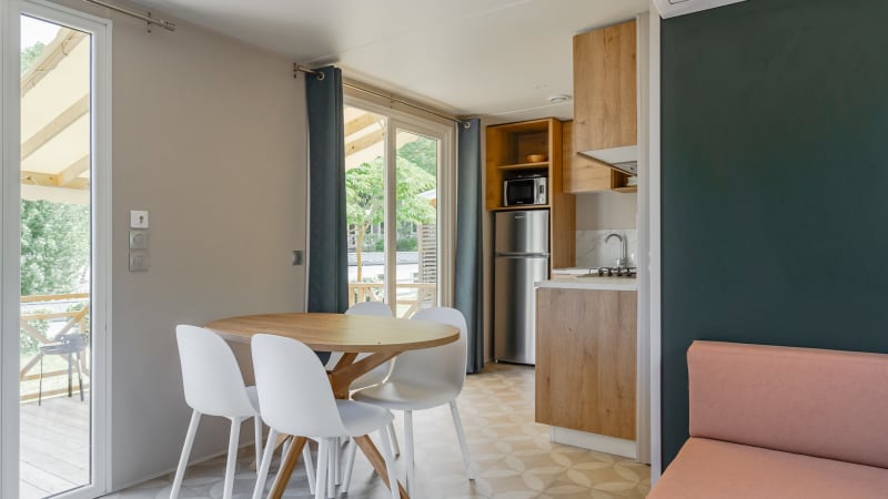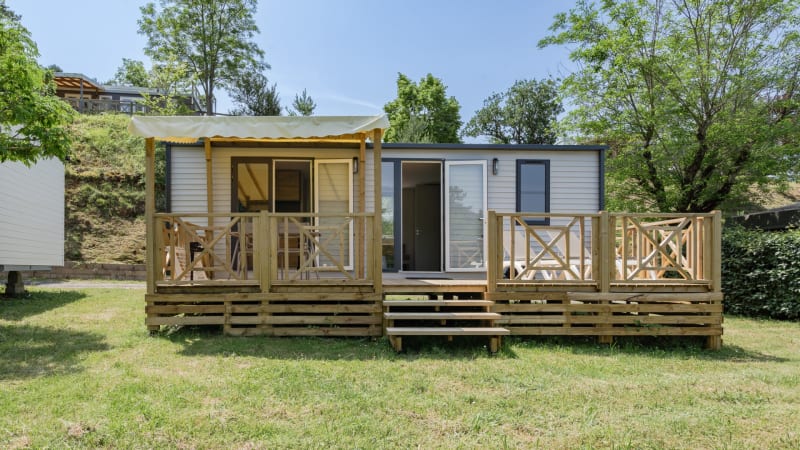 Das Mobilheim Vautour ist dank der großen Fensterfront und der Sommerküche mit Blick auf die Terrasse besonders hell. Das XL-Bad mit Dusche ist ideal für zusätzlichen Komfort. Dank seiner Fläche ist dieses Mobilheim perfekt für einen kompletten Urlaub.