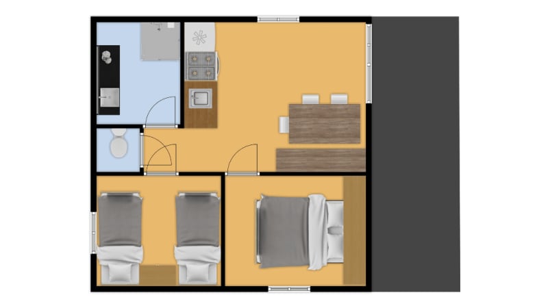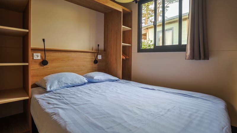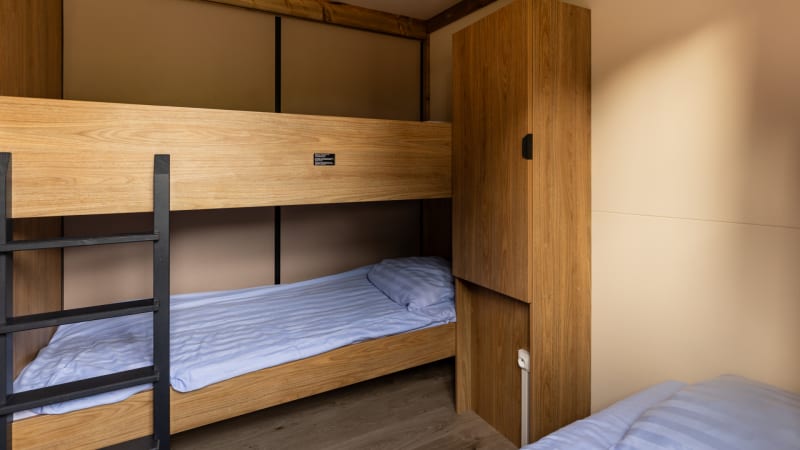 Es gibt zwei Schlafzimmer. Ein Schlafzimmer mit einem Doppelbett (140 x 200) und ein Schlafzimmer mit einem Etagenbett und einem Einzelbett (80 x 185). Jedes Bett ist mit einer einzelnen Bettdecke ausgestattet, auch die Doppelbetten.