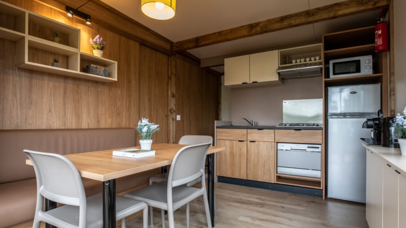 Das geräumige Wohnzimmer bietet ein Sofa und einen gemütlichen Esstisch mit drei Stühlen. Außerdem sorgt eine Elektroheizung für angenehme Raumtemperaturen.