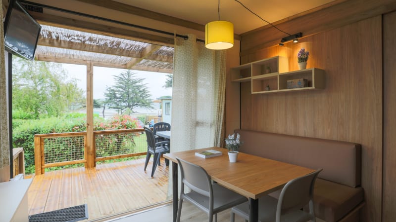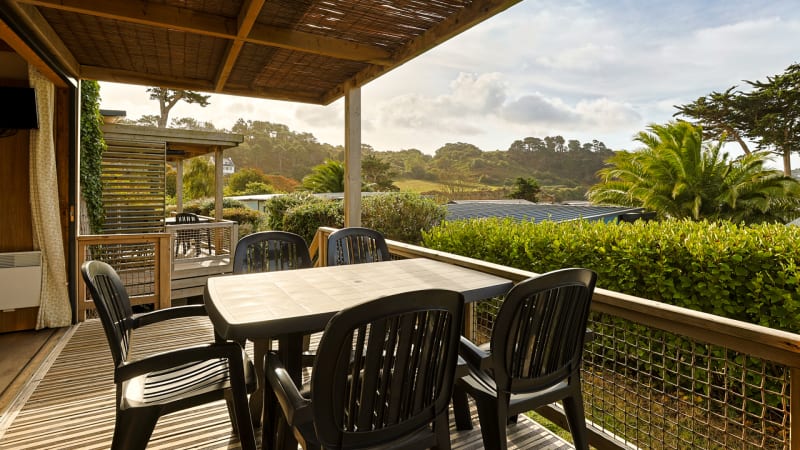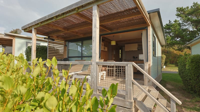Chalet Cormoran hat Schiebetüren zur großzügigen, überdachten Terrasse. Es gibt Gartenmöbel und zwei bequeme Sonnenliegen. Neben dem Chalet ist ausreichend Platz um Ihren Wagen zu parken.