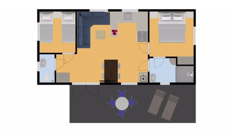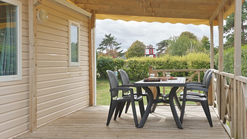 Das Mobilheim hat Flügeltüren, die auf die halb überdachte Terrasse führen. Es gibt Gartenmöbel und zwei bequeme Liegestühle, so dass Sie auch abends draußen sitzen können. Das Mobilheim bietet Platz für ein Auto.