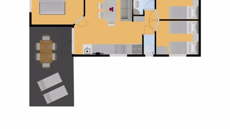 Draußen Das Mobilheim hat Türen, die auf die extra große, halb überdachte Terrasse führen. Es gibt Gartenmöbel und zwei bequeme Liegestühle, so dass Sie auch abends draußen sitzen können. Das Mobilheim bietet Platz für ein Auto.