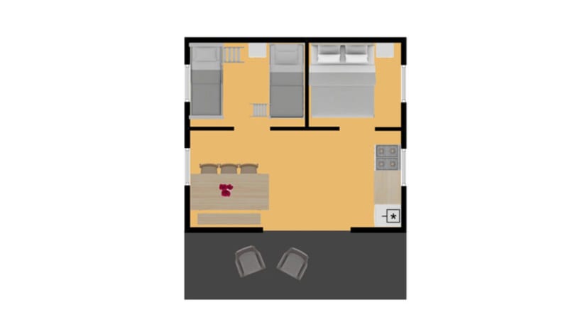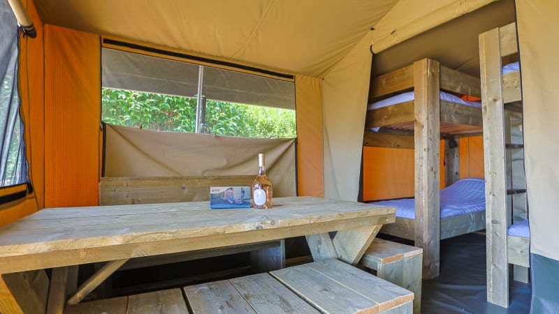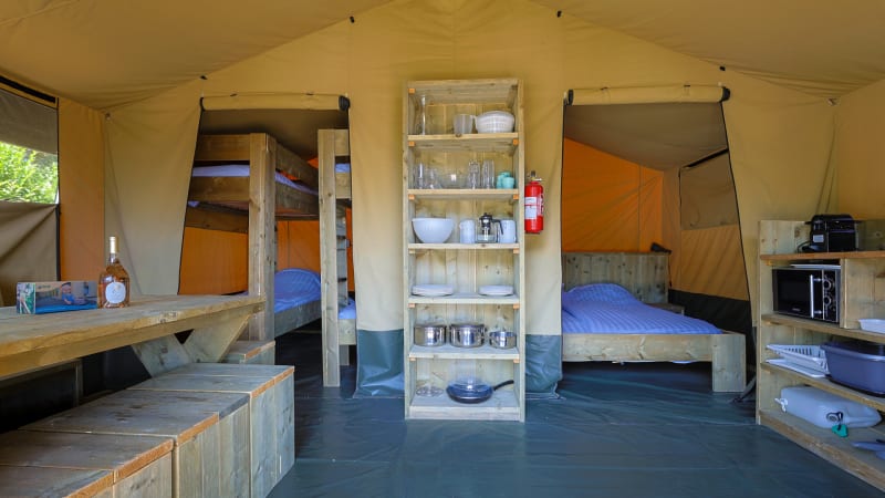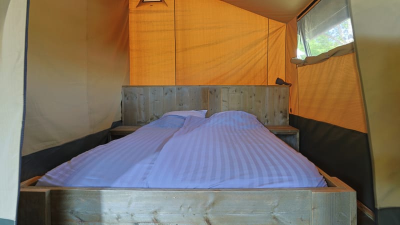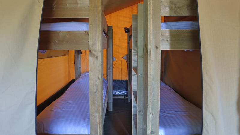 In dem Glampingzelt befinden sich 2 Schlafkabinen. Die eine ist mit einem Doppelbett (160 x 200 cm), die andere mit 2 Doppelstockbetten ausgestattet. Im Wohnzimmer kann ein Babybett aufgestellt werden.
