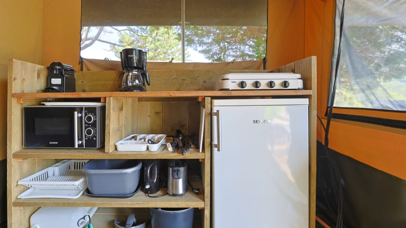 Das Safarizelt hat eine offene Küche mit einer Grundausstattung bestehend aus einem Wasserkocher, Kühlschrank mit Gefrierfach, Filterkaffeemaschine, Nespresso Kaffeemaschine, Toaster, Vier-Plattengasherd und Mikrowelle. Es gibt einen Tisch mit 6 Stühlen.