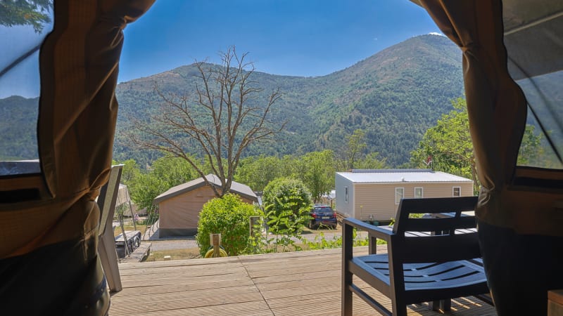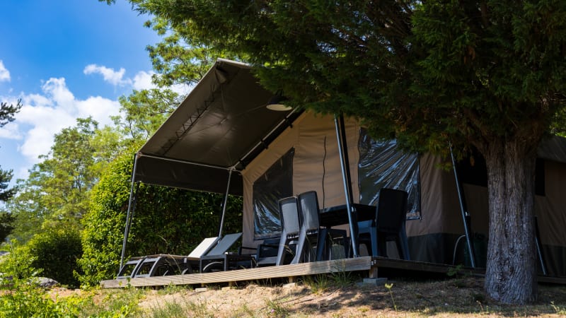 Das Glampingzelt hat ein großes Vordach. Es ist mit Gartenmobiliar ausgestattet. Das Auto muß beim Safarizelt geparkt werden.