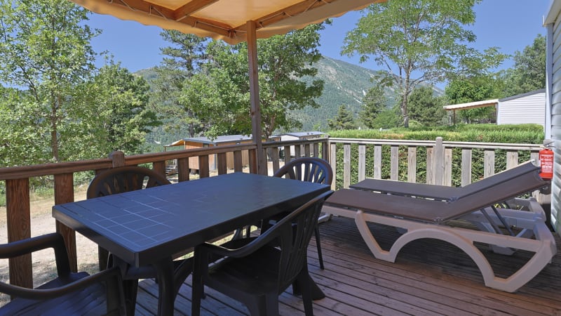 Inmitten der wunderschönen französischen Natur steht dieses komfortable, freistehende Mobilheim für vier Personen. Das Mobilheim befindet sich auf einem schönen, geräumigen Platz auf dem Terrassencampingplatz mit herrlichem Blick über die Hügel von Castellane.