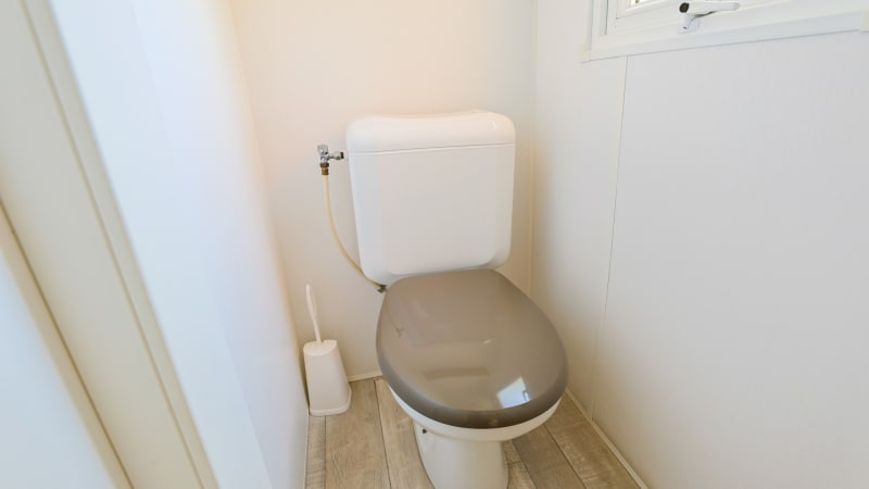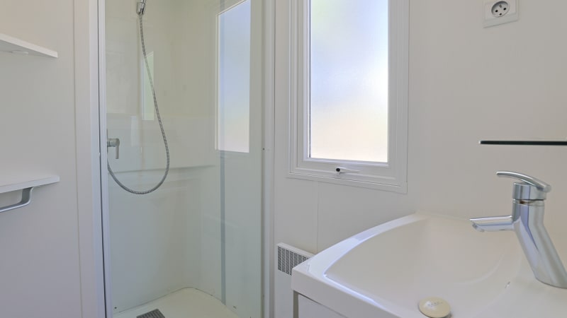 Badezimmer Das Mobilheim hat ein Badezimmer mit Dusche und Waschbecken. Es gibt einen separaten Toilettenraum.