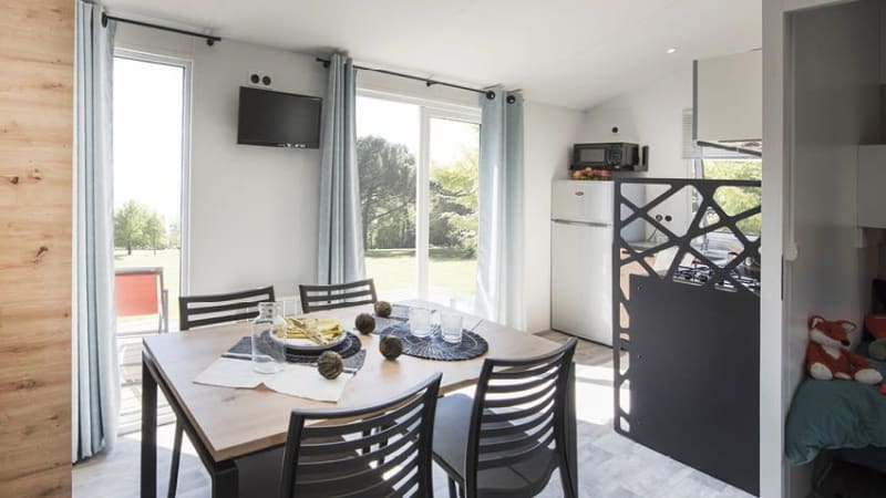 Das Mobilheim hat eine halb überdachte Holzveranda. Auf der Terrasse finden Sie einen Gartentisch mit Stühlen und zwei bequeme Liegestühle. Es gibt Platz für ein Auto bei der Unterkunft.