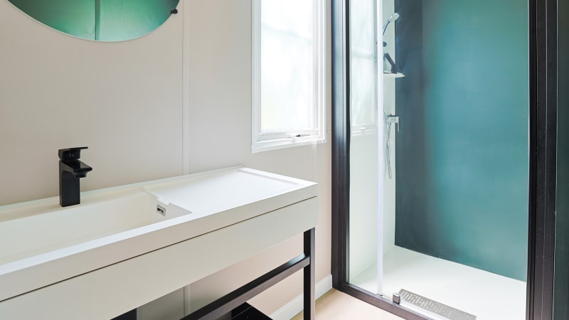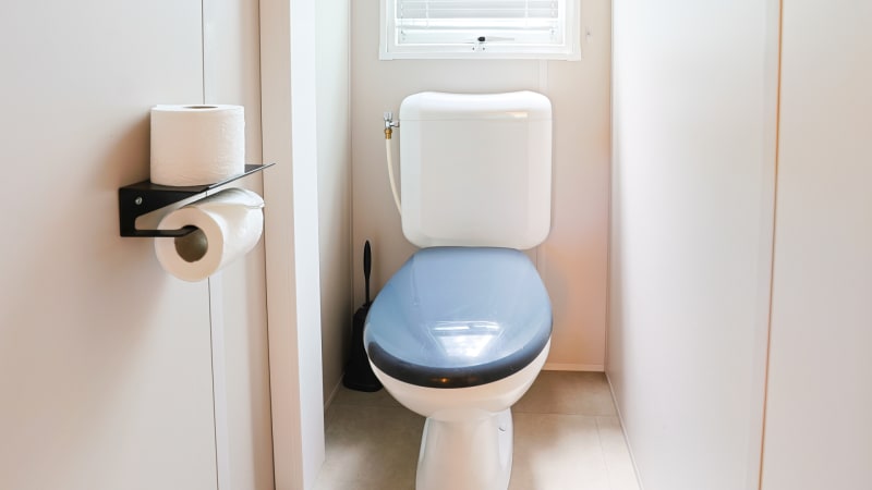 Das Mobilheim verfügt über ein Badezimmer mit Dusche und Waschbecken sowie einen separaten Toilettenraum.