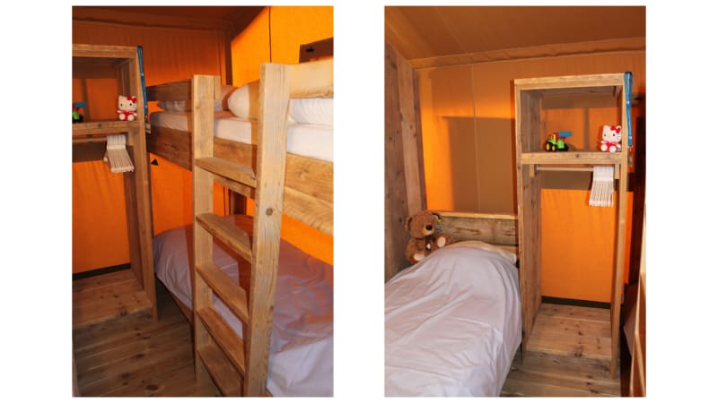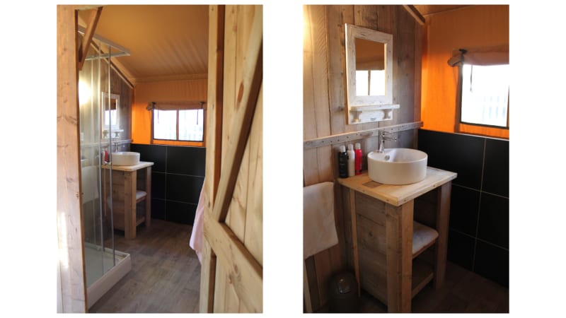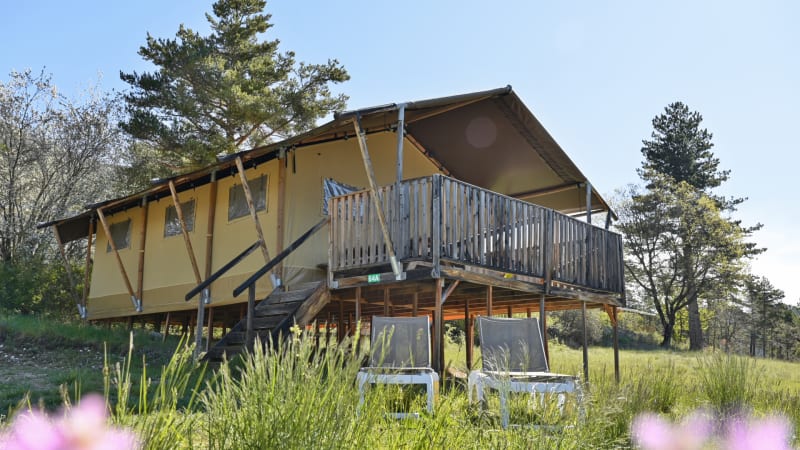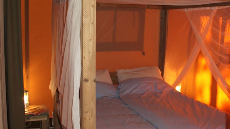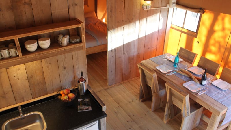 Sie campen in einem Luxus-Safarizelt an einem wunderschönen Ort. Das Safarizelt, auch gerne Sommerlodge genannt, steht auf Pfählen und hat eine schöne Terasse.