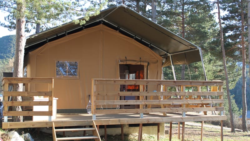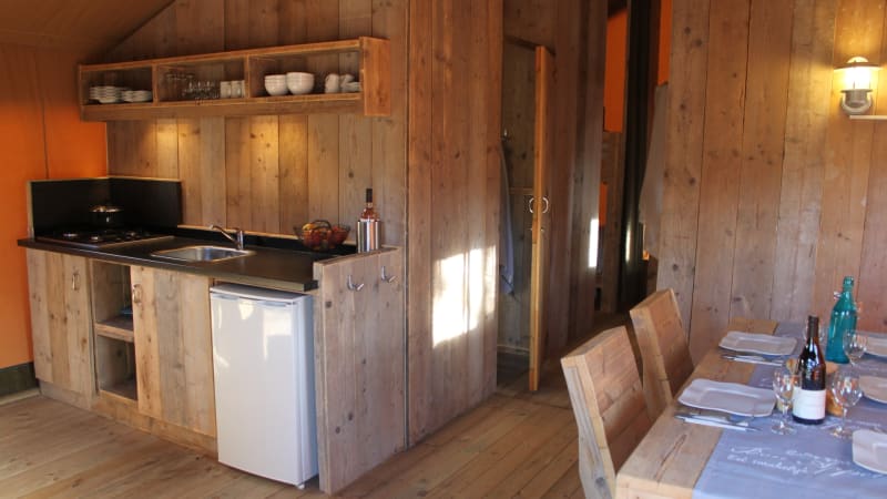 Die Küche ist mit einer 4-Platten Kochstelle, einem Kühlschrank und Küchenbeständen ausgestattet. In dem Safarizelt zu campen bedeutet Glamour in der Natur, beziehungsweise zum "glampen" müssen Sie bei RCN les Collines de Castellane sein.