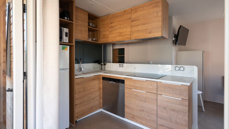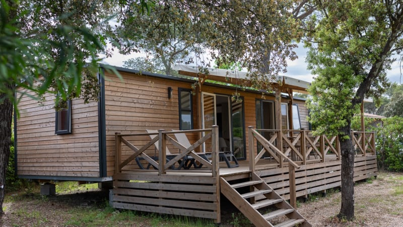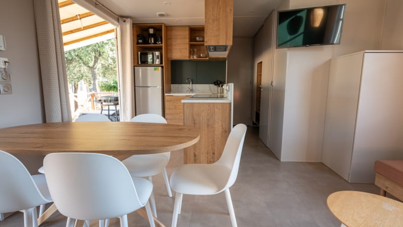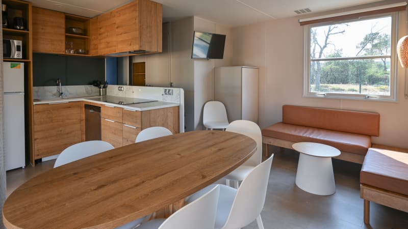 Dieses sechs Personen-Mobilheim ist mit allen modernen Annehmlichkeiten ausgestattet und verfügt über zwei Badezimmer. Dieses Mobilheim verfügt über eine luxuriöse Innenausstattung mit natürlicher Optik. Die Mobilheime liegen zwischen Privatunterkünften und haben einen eigenen Garten.
