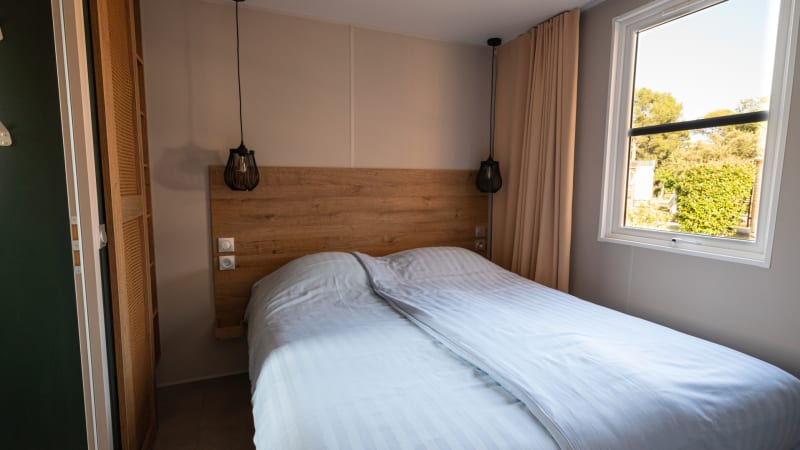 Das Mobilheim hat drei Schlafzimmer, eines davon mit einem doppelten Boxspringbett (160 x 200) und eigenem Bad. Die beiden anderen Schlafzimmer haben jeweils zwei Einzelbetten (80 x 190). Eines der beiden Schlafzimmer hat ein Etagenbett. Die Betten sind mit Kopfkissen und Einzelbettdecken ausgestattet. Das Zustellen von einem Kinderbett ist möglich.