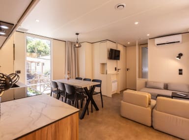 In unserem Park gibt es die luxuriösesten Mobilheime für 4 Personen. Neben einer Standardterrasse verfügen diese Typen auch über eine Dachterrasse. Von diesem Panoramadach aus haben Sie eine prächtige Aussicht auf die berühmten Roquebrune. Der große Wohnbereich erhält viel Sonnenlicht, doch bleibt die Temperatur Dank der Klimaanlage angenehm. Weiterhin sind diese luxuriösen Mobilheime mit einer Spülmaschine, einer Kombimikrowelle und einem Senseo ausgestattet.