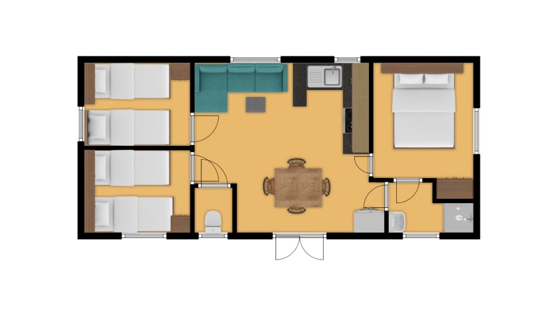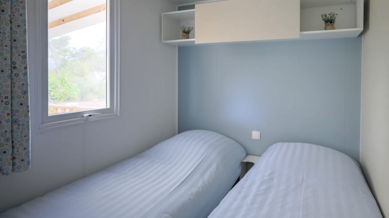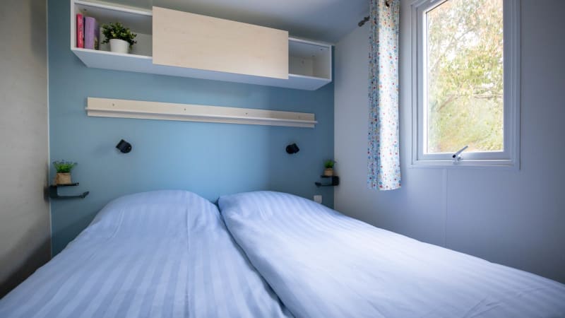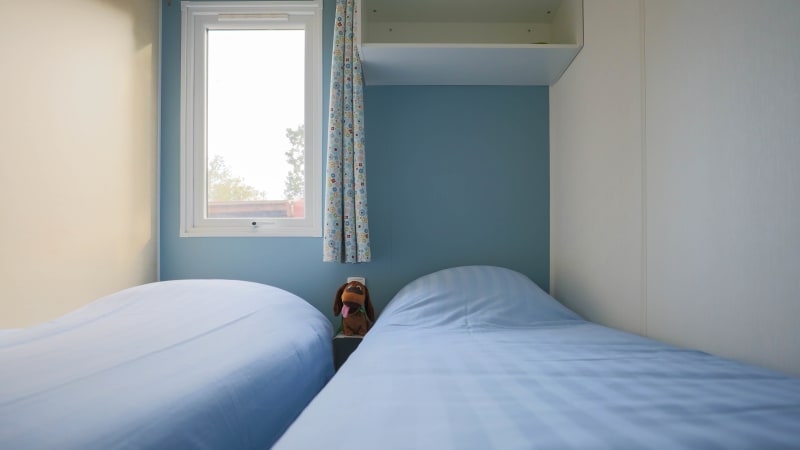 Das MH hat 3 Schlafzimmer, davon eins mit Doppelbett (160 x 200) und eigenem Bad. Die anderen beiden Schlafzimmer haben je 2 Einzelbetten (80 x 190). Die Schlafzimmer sind mit Matratzen, Kissen und Einzelbezügen ausgestattet. Das Zustellen von einem Kinderbett ist möglich.