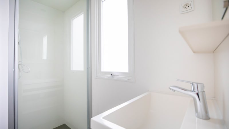Das Badezimmer ist mit einer Dusche und einem Waschbecken ausgestattet. Zusätzlich gibt es eine separate Toilette.