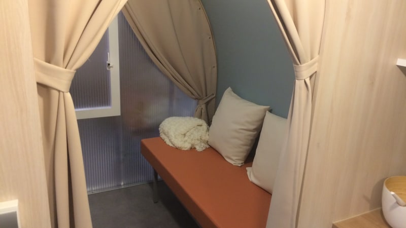 Wohnzimmer Im innovativen Design des Zelts wurde der 16 m2 große Raum für maximalen Wohnkomfort optimiert. Mit fröhlichen Farben und klaren Linien betreten Sie einen wahren "Kokon". Eine elektrische Heizung ist auf Anfrage erhältlich. Das Zelt ist vollständig isoliert und kann bei Nichtgebrauch komplett geschlossen werden.