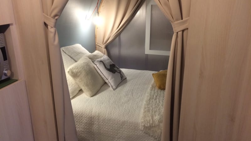 Unter dem Vorzelt können Sie auf einem Gasherd mit 2 Flammen kochen. Im Inneren befindet sich eine Küchenzeile mit einer normalen Mikrowelle, einem Kühlschrank mit Gefrierfach und einer Senseo-Kaffeemaschine.