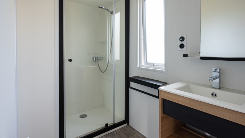 Vier-Personen-Mobilheim im autofreien Bereich. Parken Sie Ihr Auto auf den nahe gelegenen Parkplätzen und dann geht es zu Fuß zu Ihrer Unterkunft. Hier gibt es keine vorbeifahrenden Autos, die Kinder können unbesorgt spielen. Das Mobilheim mit Terrasse steht auf einem großen Grundstück und ist komplett ausgestattet.