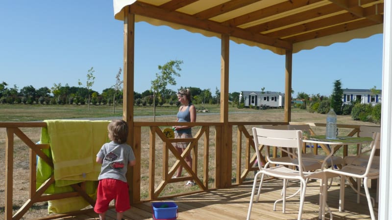 Draußen Von der sehr geräumigen, halb überdachten Holzterrasse können Sie die Kinder auf der Wiese vor dem Mobilheim spielen sehen. Es gibt viel Platz, um in der Sonne oder im Schatten zu sitzen. Auf der Terrasse stehen moderne Gartenmöbel mit einem Tisch, sechs Stühlen und zwei Liegestühlen. Sie können Ihr Auto an der Unterkunft parken.