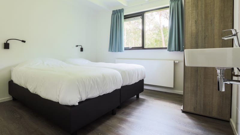 Schlafzimmer Es gibt drei Schlafzimmer für vier Personen. Das Zweibettzimmer hat ein eigenes Bad mit Dusche, Waschbecken und Toilette. Die anderen Schlafzimmer haben ein Einzelbett. Es ist möglich, ein Kinderbett hinzuzufügen.