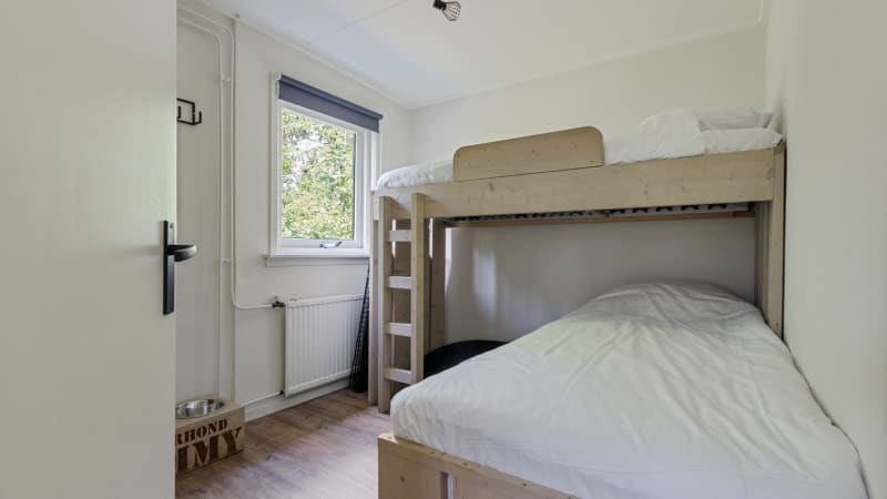 Der Bungalow hat zwei Schlafzimmer. Das erste Schlafzimmer hat zwei Einzel-Boxspringbetten von 0,80 mal 2 Metern, das zweite Schlafzimmer hat ein Etagenbett. Die Schlafzimmer sind mit einem Waschbecken ausgestattet. Es ist möglich, ein Babybett hinzuzufügen. Einzelne Bettdecken und Kopfkissen sind bei der Ankunft erhältlich.
