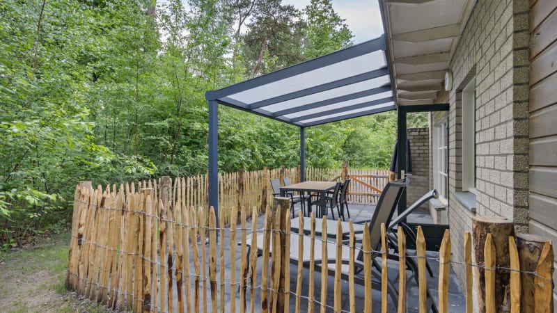 Durch die Doppeltüren im Wohnzimmer gelangt man auf die eingezäunte und großzügige Terrasse mit viel Privatsphäre. Von der nach Süden ausgerichteten Terrasse mit komfortablen Gartenmöbeln aus können Sie die schöne Natur um sich herum genießen und einen Blick auf die kleinen Waldbewohner erhaschen.