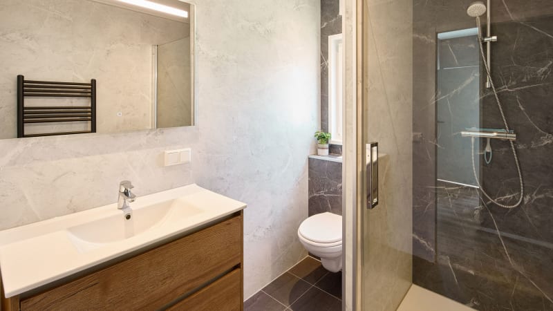 Das moderne Badezimmer verfügt über eine geräumige Duschkabine, ein Waschtischmöbel und eine Toilette. Zusätzlich gibt es eine zweite, separate Toilette.