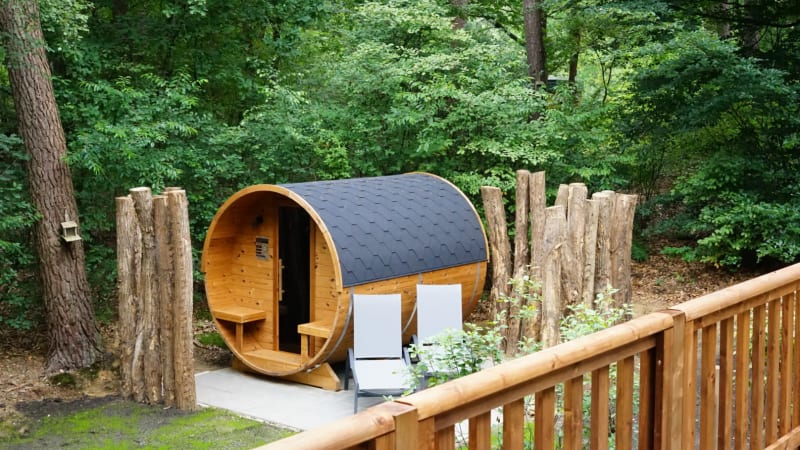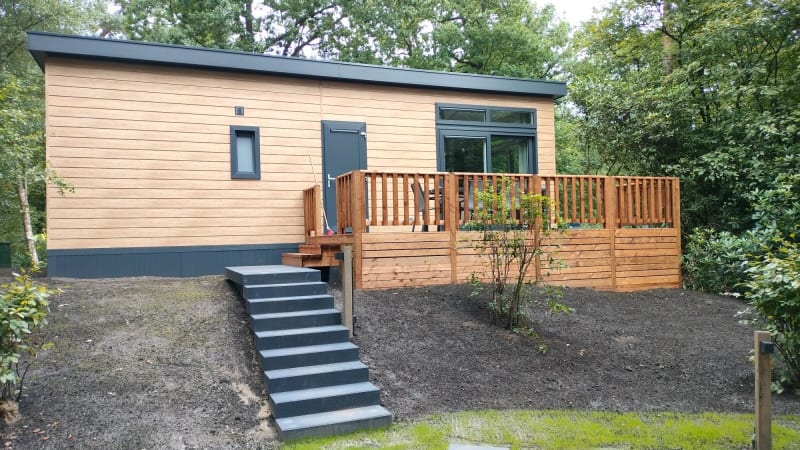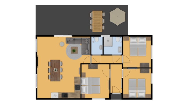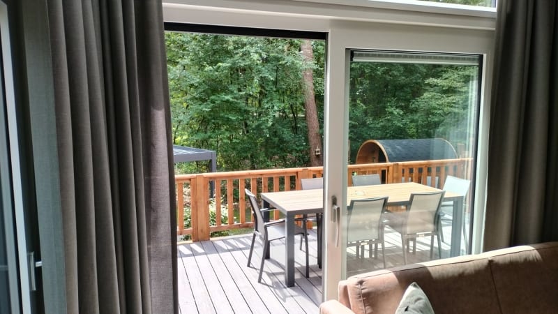 Die vergrößerte Außenterrasse ist mit Gartenmöbeln für sechs Personen, zwei Liegestühlen, einer Lounge-Ecke und einem überdachten Bereich ausgestattet. Direkt am Chalet befindet sich ein eigener Parkplatz.