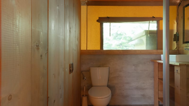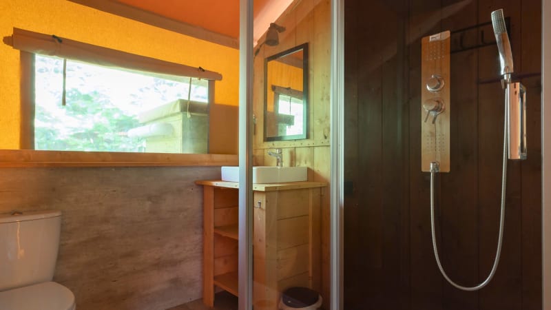 Badezimmer Das Safarizelt hat ein eigenes Badezimmer mit Dusche, einer Toilette und einem Waschbecken.