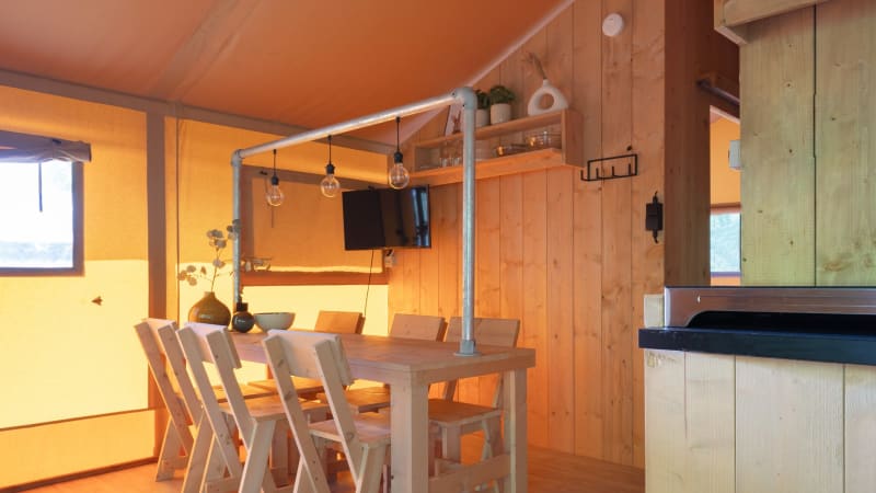 Das gemütliche Wohnzimmer ist mit einem großen Esstisch und sechs Stühlen ausgestattet. Besonders luxuriös: Dieses Safarizelt verfügt über Bodenheizung.