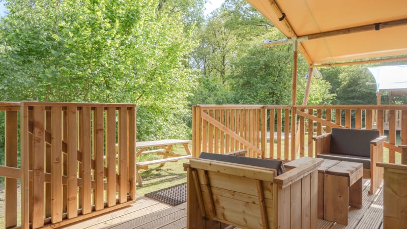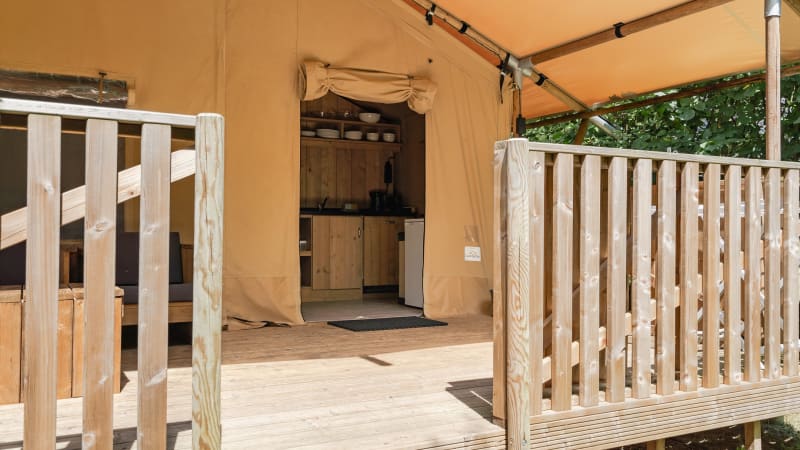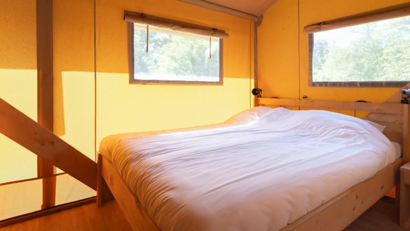 Das Safarizelt verfügt über ein Doppelbett (200x160cm), ein Einzelbett (200x80cm) und ein Etagenbett (200x80cm). Die Betten sind alle mit Kissen und Bettdecken ausgestattet.