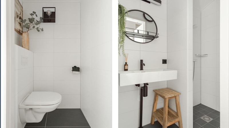 Der Bungalow hat ein Badezimmer mit Dusche, Waschbecken und einer separaten Toilette.