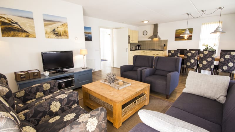 Erdgeschoss Die Villa vom Typ Goudplevier verfügt über ein Wohnzimmer mit offener Küche. Über eine Flügeltür gelangen Sie auf die Holzterrasse mit schönen Gartenmöbeln. Es gibt 1 Doppelschlafzimmer mit Bad und separater Toilette.