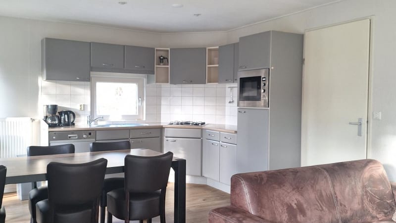 Das Chalet verfügt über ein großes Wohnzimmer mit einer geräumigen Sitzecke und Flügeltüren zu Ihrer Terrasse im Süden. Die Küche ist komplett eingerichtet und ausgestattet mit Geschirrspüler und Kombi-Mikrowelle.