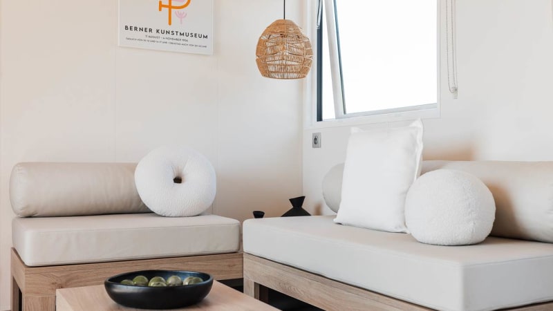 Wohnzimmer Das Wohnzimmer verfügt über zwei feste Sofas und einen Essbereich für vier Personen.