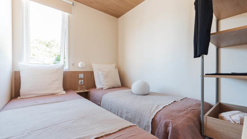 Schlafzimmer Das Mobilheim hat zwei Schlafzimmer. Ein Schlafzimmer ist mit einem Doppelbett, das andere mit zwei Einzelbetten ausgestattet.