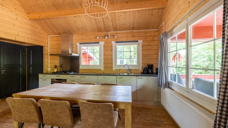 Es gibt 3 Schlafzimmer, zwei davon befinden sich im Erdgeschoß, das dritte im Dachgeschoß. Die Finnische Lodge verfügt über ein Badezimmer mit WC, Dusche und Waschbecken. Außerdem gibt es eine geräumige Küche mit Mikrowelle und Geschirrspüler.