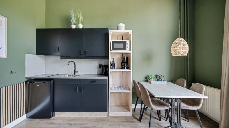 Die Küchenzeile hat 2 elektrische Kochplatten und eine Mikrowelle, weiter eine Essecke für 2 Personen. Im Badezimmer sind ein Waschbecken und eine Duschkabine.