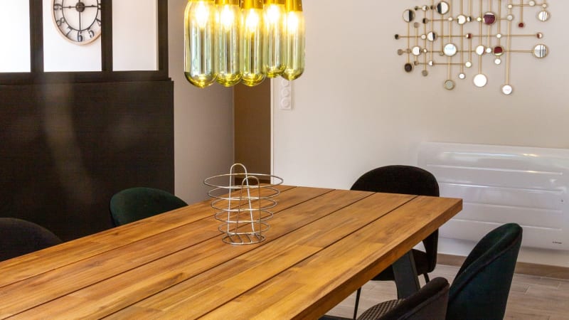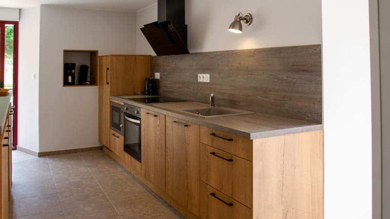 The house has a very spacious living room/kitchen of 45m². The interior has been carefully furnished to create a harmony of old and modern. The kitchen has two kitchen blocks, 4-burner induction hob, fridge, electric oven, microwave, Nespresso coffee machine, filter coffee machine, dishwasher, sink with mixer tap. There is enough space in the cabinets to store food and drink supplies. You can step into the patio from the kitchen.