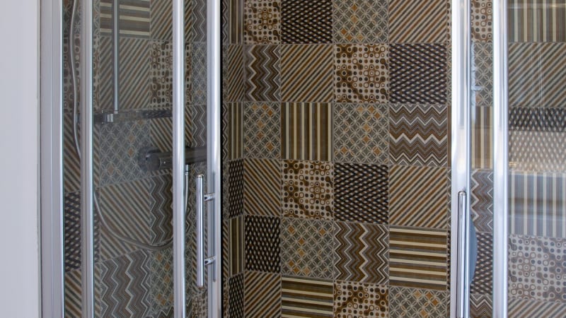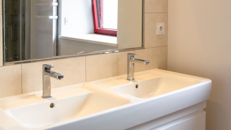 The bathroom has a spacious shower, two separate washbasins and a towel dryer. The toilet is in the hallway next to the bathroom.