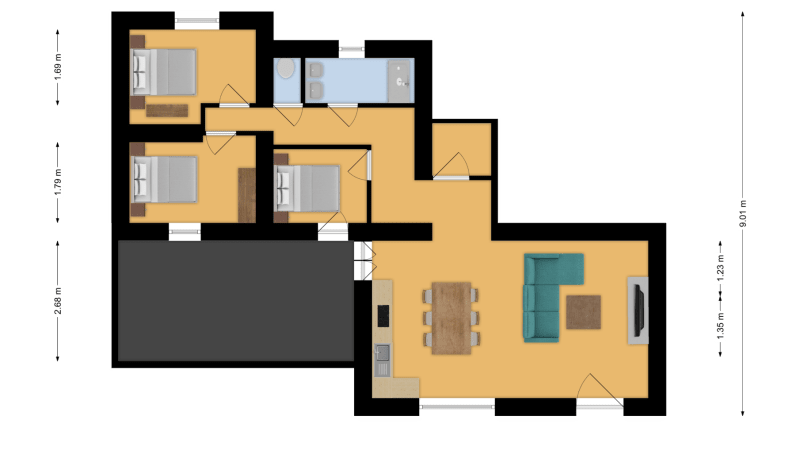 A corridor leading off from the living room takes you to the side wing of the house. Here are three bedrooms and a bathroom. Each bedroom has two box-spring beds, two metres long with thick mattresses.