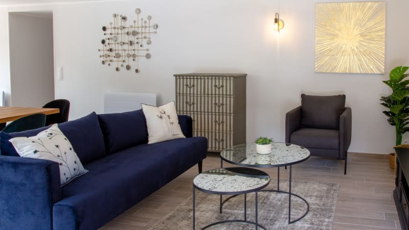 The front door takes you straight into the living room. The living room has a large sliding window with a view over the campsite. The furnishings are comfortable and modern. The large dining table separates the living room and kitchen and seats up to seven people.